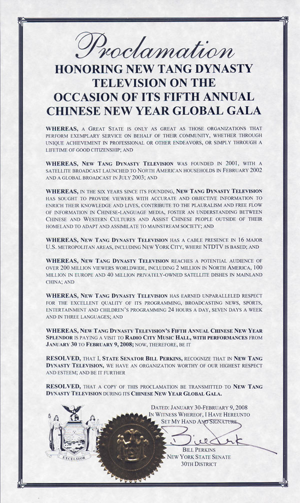 鑑此,我,紐約州參議員比爾•博金斯(Bill Perkins),嘉獎新唐人電視台,新唐人電視台值得我們給予最高的敬意。