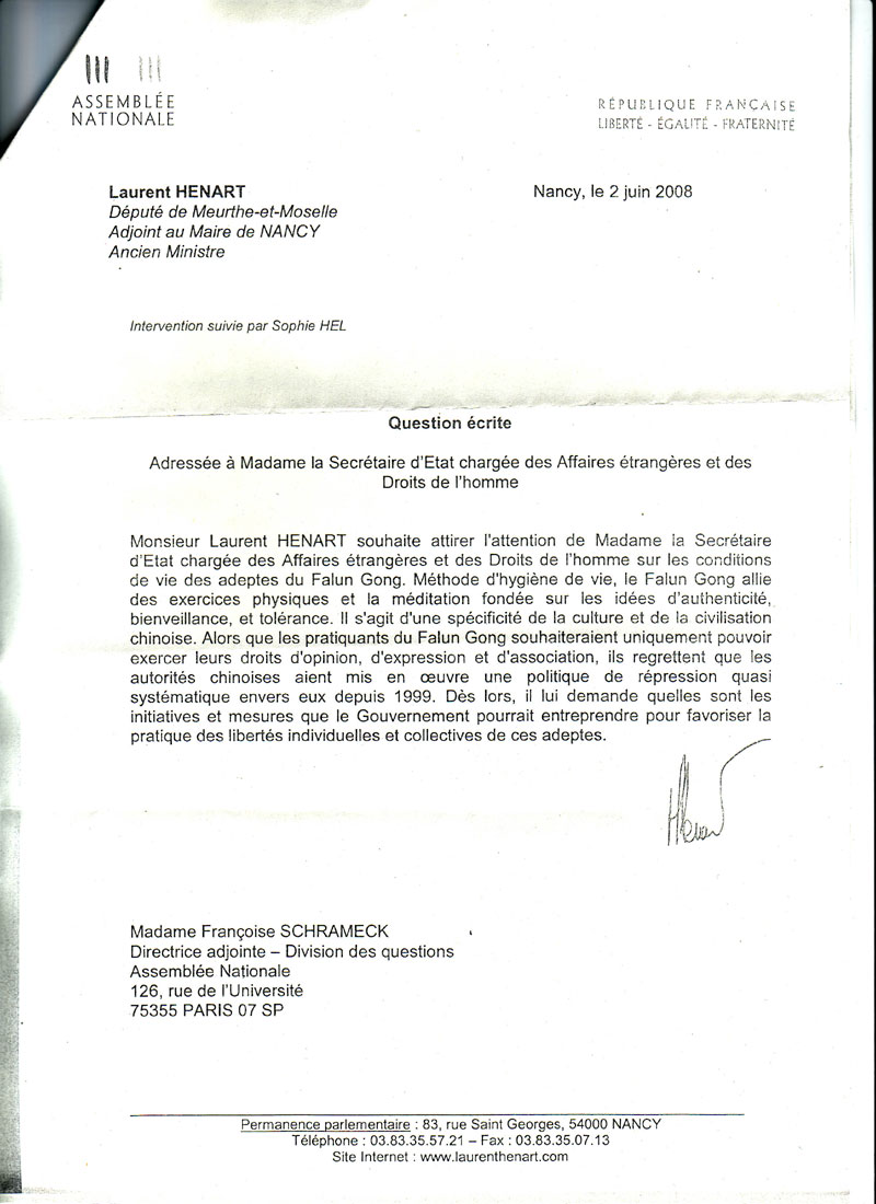 法輪功是生活健康的一種(修煉)方法,是以真、善、忍的思想為基礎的身體練習和打坐,是中國文化和文明的一個特色。然而法輪功學員只希望能夠實行信仰、言論和集會的權利,他們對中國當局自一九九九年向他們發起的完全是系統的鎮壓政策表示遺憾。因此,羅朗﹒艾納詢問國務秘書女士,為有助於實現這些(法輪功)成員個體的和集體的自由,(法國)政府能夠著手進行的有哪些措施和辦法。