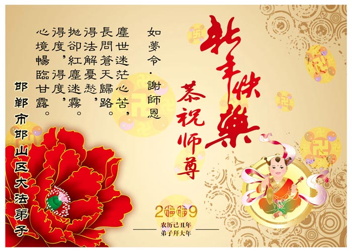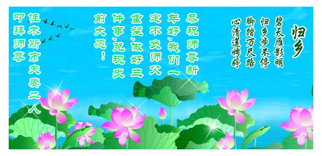 祝賀師尊新年快樂。弟子在新的一年裏一定更加精進,救度更多眾生。讓師尊多一份欣慰,少一份操勞。
