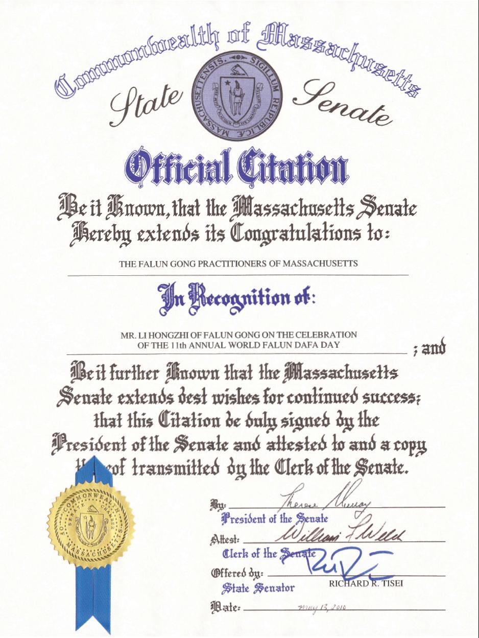 麻州參議院獻上最美好的祝願,祝不斷取得成功。此褒獎狀由參議院主席簽署並由參議院秘書作證明和傳遞。
