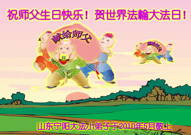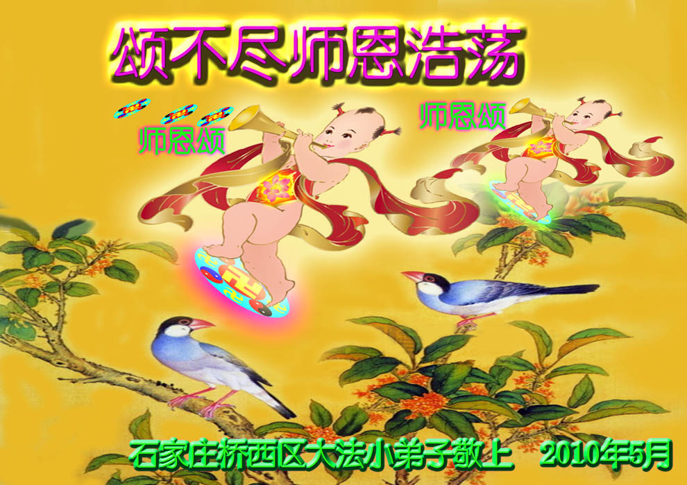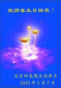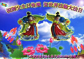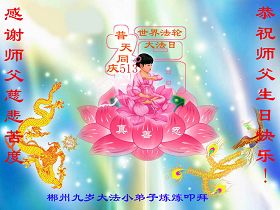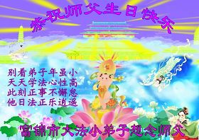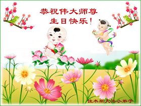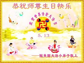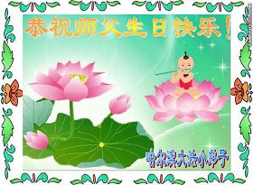 師父您辛苦了!在這天地同歡慶的日子裏,我們一定不辜負您的期望,多學法勤煉功,三件事記心中,以後我們更會勇猛精進,返本歸真隨師還。