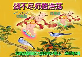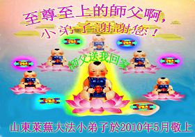 尊敬的師父:我多麼想見您啊!我是一個貪玩的小弟子,我今年10週歲了,我對不起師父的一片苦心救度,但是我有決心做一個合格的大法小弟子,跟隨師父回家!!