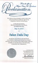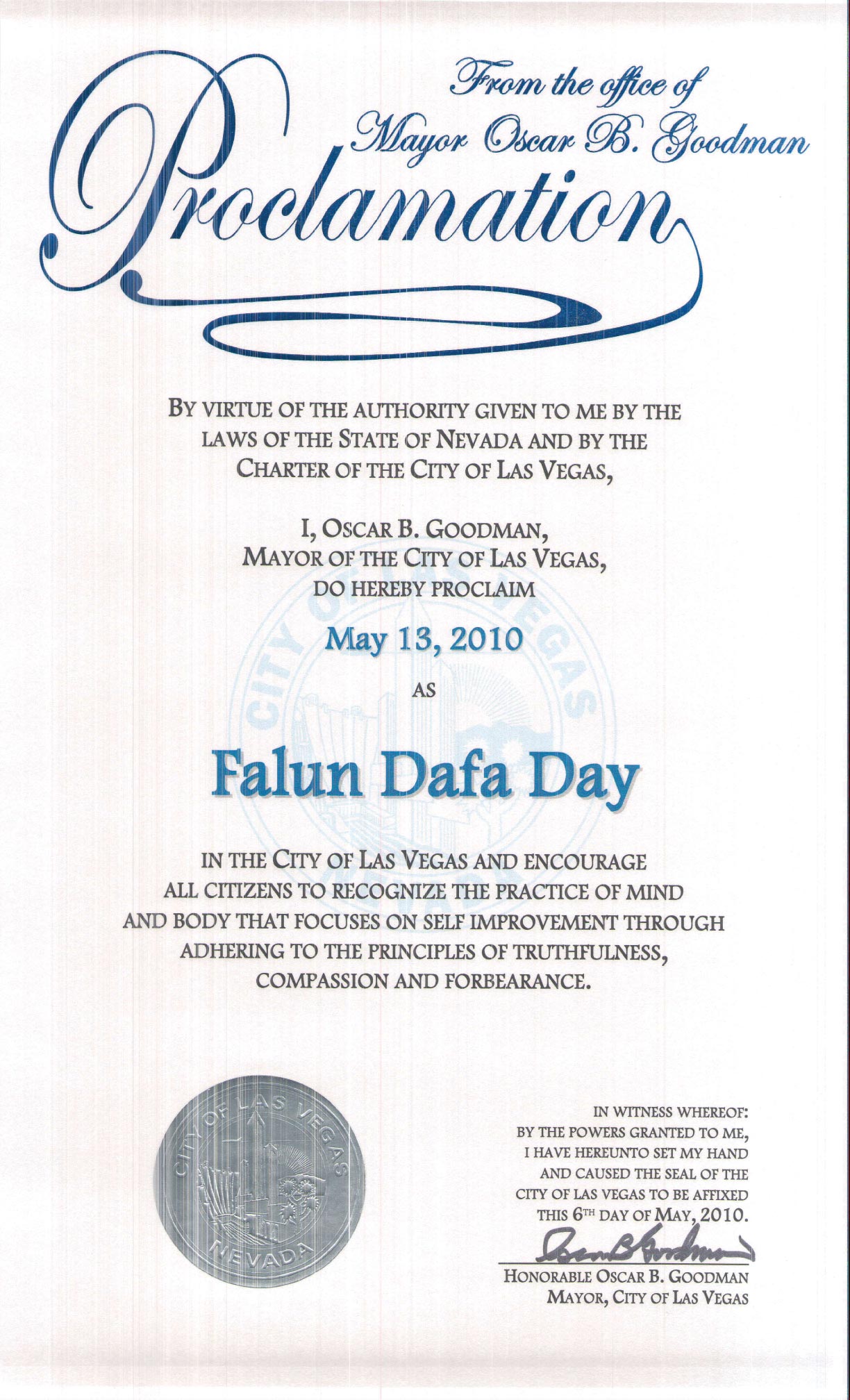 我以內華達州拉斯維加斯市法律授予我,奧斯卡﹒古德曼市長的身份,宣布二零一零年五月十三日為拉斯維加斯市法輪大法日,我鼓勵全市市民認同這一以真善忍為原則修心養性自我昇華的修煉方法。