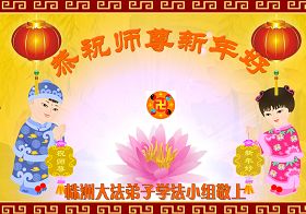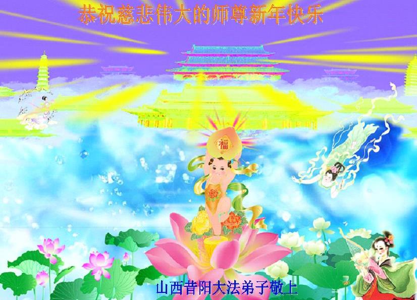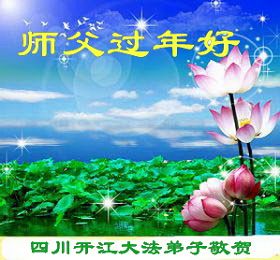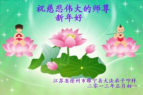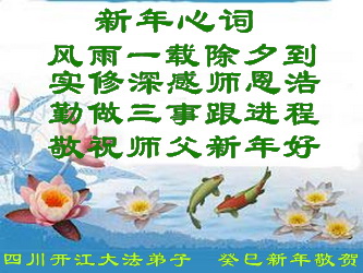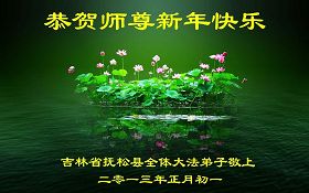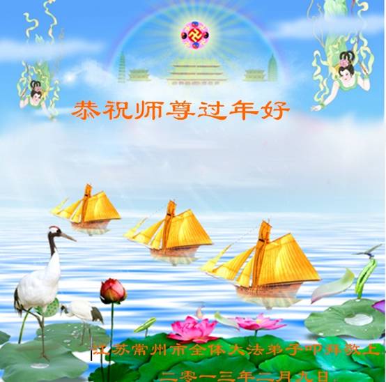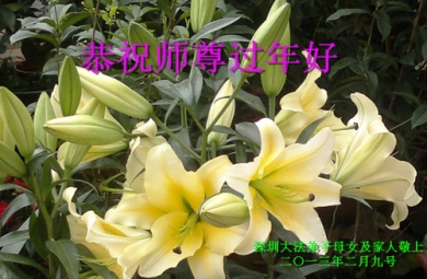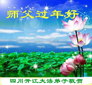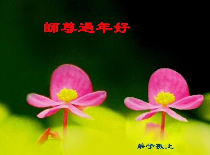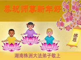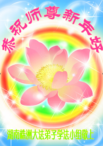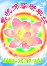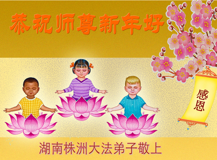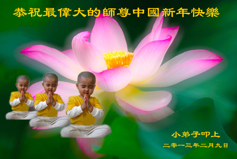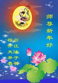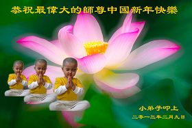 慈悲偉大的師尊您辛苦了!謝謝您的慈悲苦度!弟子們滿懷感恩和敬仰的心情在此給師尊拜年!師尊新年好!在新的一年裏,弟子們將繼續學好法,從自己的一言一行上堅定的實修。努力做好三件事,多救人,讓師尊多一些欣慰!