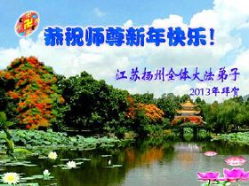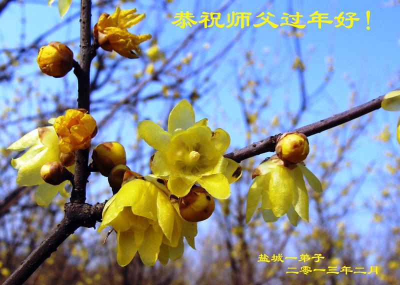 過年了,鹽城大法弟子更加想念師父,在此向慈悲偉大的師父拜年! 在這最後的有限時間裏,我們一定牢記師父教誨,學好法,做好最後應做的事,去掉一切執著,精進再精進,圓滿隨師還。
