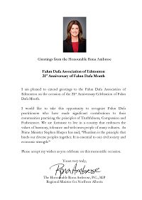 近日,亞省北部區域部長、保守黨成員、國會議員羅娜﹒安布魯斯發來褒獎信函,感謝法輪大法學員秉承「真善忍」原則,對社區作出的巨大貢獻。