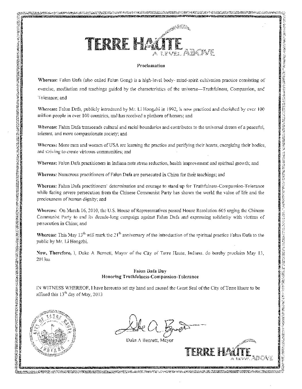 鑑此,我,印第安納州特雷霍特市(Terre Haute,Indiana)市長杜克﹒阿﹒貝乃特 (Duke A Bennett),特此宣告二零一三年五月十三日為印第安納州特雷霍特市法輪大法日, 頌揚真、善、忍。