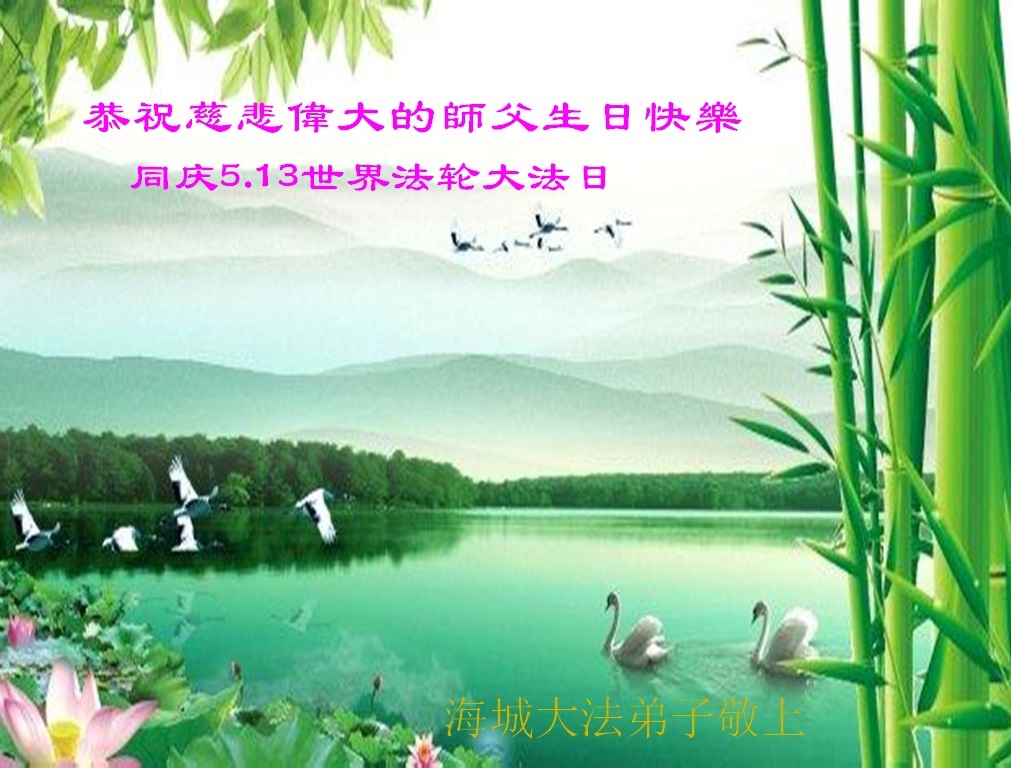 無法描述多年來師父對我們大法弟子的慈悲呵護,幸運得大法。做好弟子的三件事。相互配合,圓容整體。讓師父欣慰。大法弟子恭祝師父生日快樂。同賀世界法輪大法日。