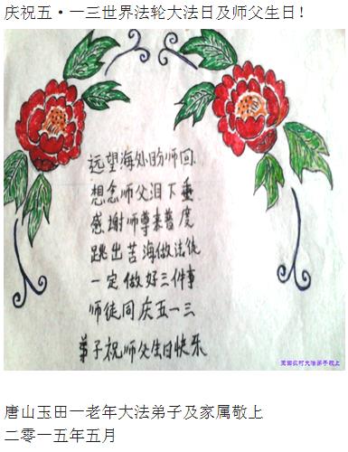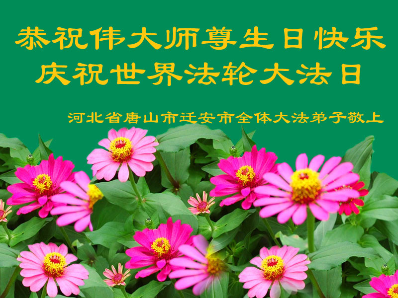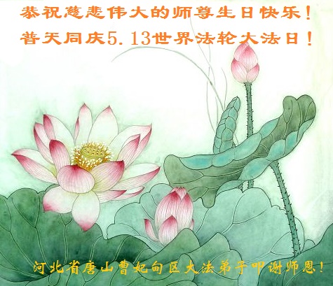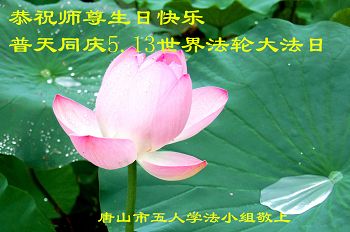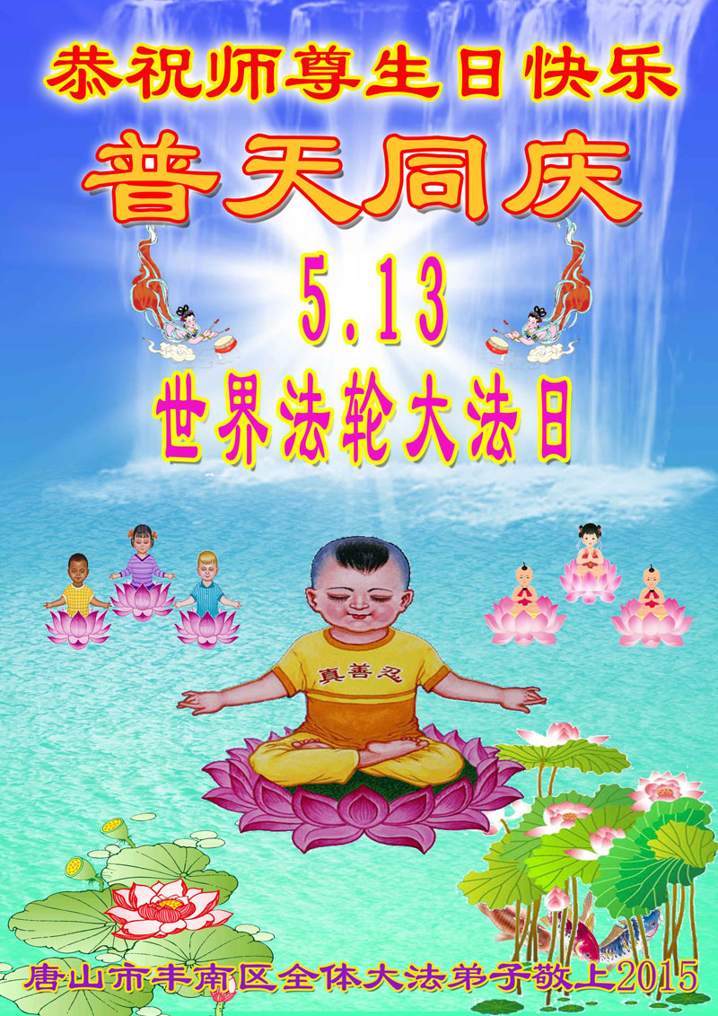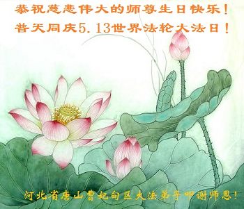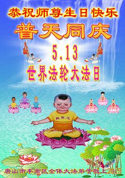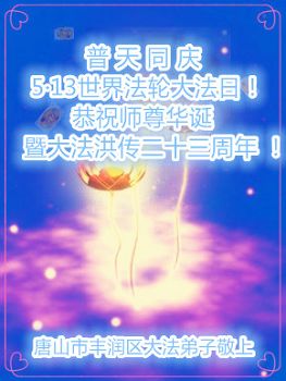 在世界法輪大法日到來之際,唐山市豐潤區大法弟子與全世界大法弟子一起,普天同慶、同頌、同賀師尊華誕暨法輪大法洪傳二十三週年!弟子謹記師尊修煉如初的教誨,精進再精進,三件事都做好,修好自己,多救眾生,不辱使命,兌現誓約,讓師父放心!