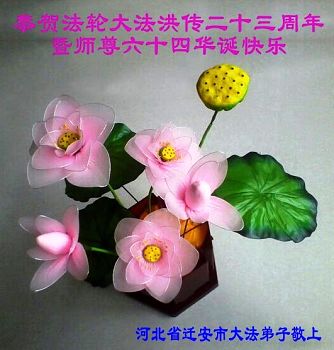 值此師尊華誕暨大法洪傳世界二十三週年的美好節日裏,弟子感頌師恩之情,無以言表。唯有精進實修心性,抓緊做好三件事,完成助師正法、救度眾生的神聖使命,兌現久遠的誓約。讓師尊少一點操心,多一點欣慰,跟師尊圓滿回家。