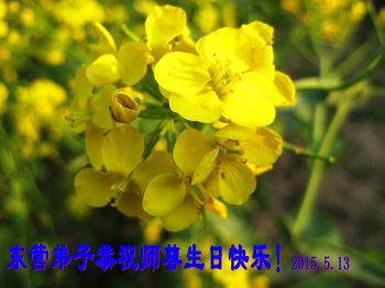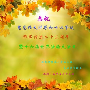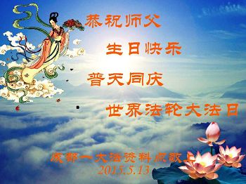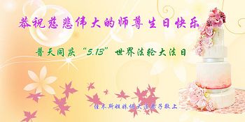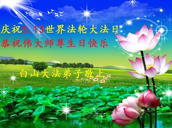 師尊您好:弟子恭祝師尊生日快樂!祝法輪大法洪傳世界23週年,祝賀法輪大法日16週年。弟子一定聽您的話做好三件事,實修自己做您的真修弟子,修成為他的生命,自己在面對面講真相上和同修比還差得很遠,但我會做好,一定不辜負這萬古機緣和師尊的慈悲苦度。和師父回家。