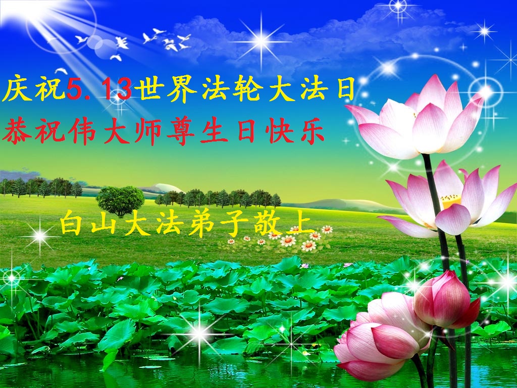 五月十三日是師尊華誕暨世界法輪大法日,偉大的師尊慈悲救世,將宇宙大法開傳,這是全宇宙的福份,是人類之大幸。我們能得到大法的福澤是永生永世的幸福和榮耀,我們一定要珍惜這萬古機緣,精進實修,老老實實聽師父的話,修好自己,救度世人,圓滿隨師回家。