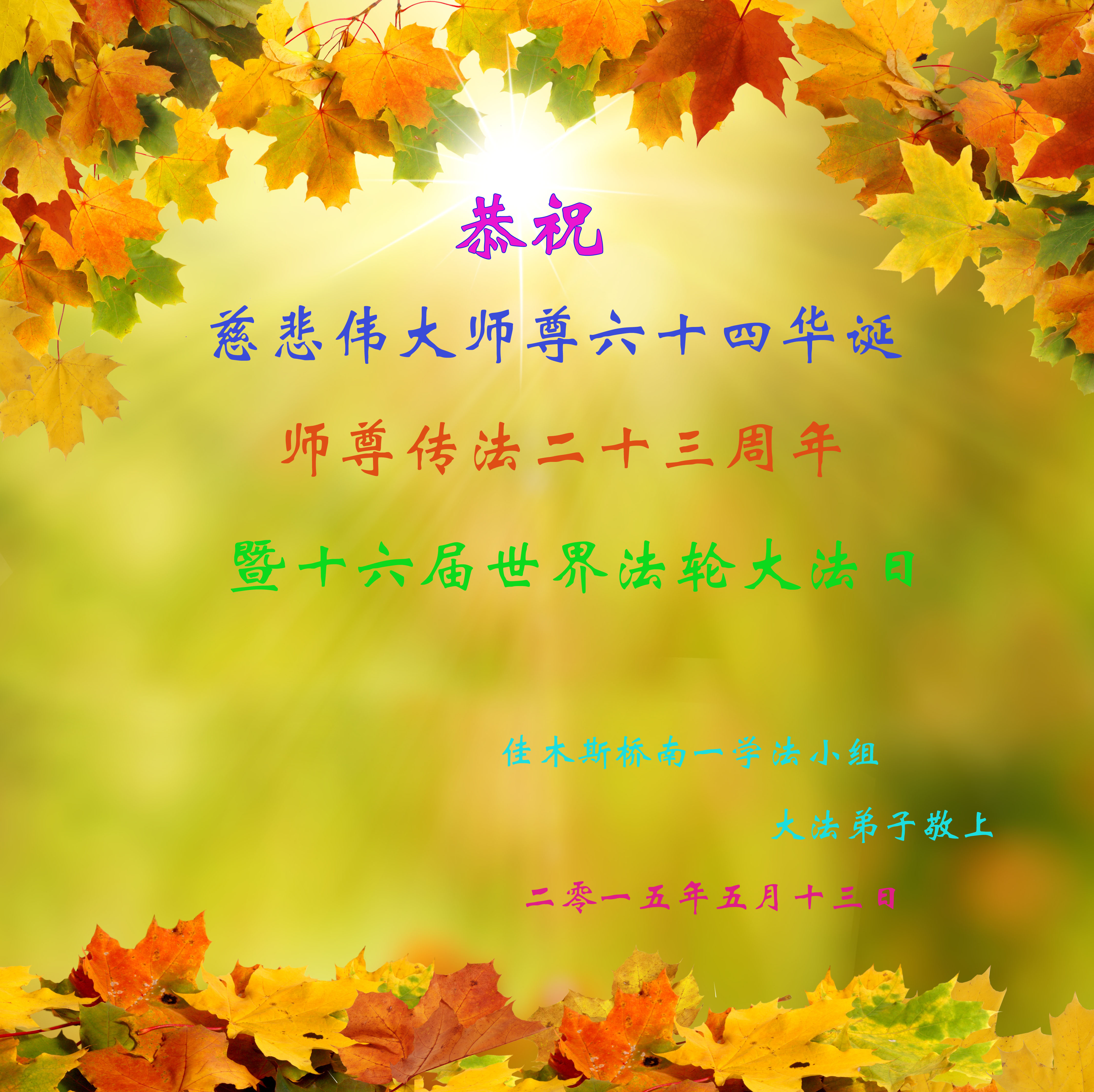 黑龍江省勃利縣南片全體大法弟子,在世界法輪大法日來臨之際,我們共同慶祝法輪大法日並恭祝師尊生日快樂!我們一定多學法努力做好三件事,讓師尊少一份操勞,多一份欣慰。