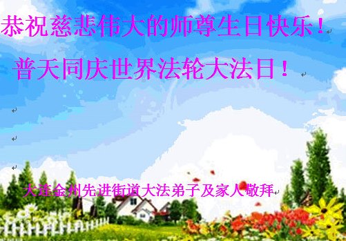 遼寧省大連金州先進街道大法弟子及家人恭祝師尊生日快樂!普天同慶世界法輪大法日!