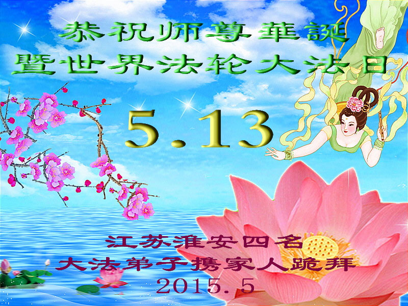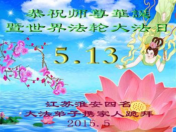 江蘇淮安四名大法弟子攜家人恭祝慈悲偉大的師尊生日快樂!慶祝法輪大法傳世二十三週年!感恩師尊慈悲救度!