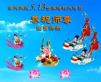 一年一度的世界法輪大法日5.13已來臨。在這普天同慶的時刻,我們大陸大法弟子感慨萬千。我們雖然與師尊遠隔千山萬水,但是我們時刻沐浴在師尊的浩蕩佛恩之中,不管遇到甚麼困難、挫折,在師尊的慈悲呵護下,我們都能順利闖過來,過程中,雖然磕磕絆絆,雖然不盡人意,但是跟著師尊回家的決心半點也沒有鬆懈。我們感激師尊為我們延續來的時間,讓我們修好自己多救人。我們一定做好三件事,兌現自己史前誓約,不辜負師尊慈悲的救度,精進實修,一定跟師尊回家。