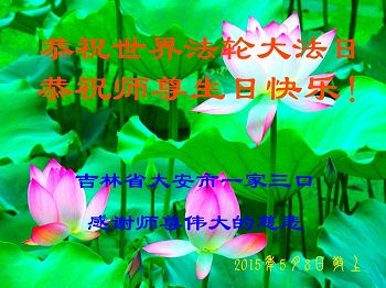 吉林省白城大安市一家三口大法弟子恭祝世界法輪大法日!恭祝師尊生日快樂!