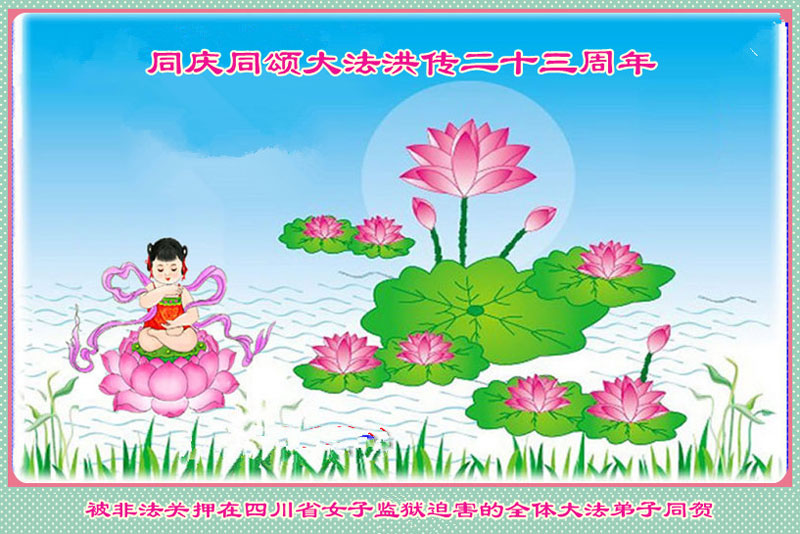 被非法關押在四川省女子監獄迫害的全體大法弟子同慶同頌大法洪傳二十三週年!