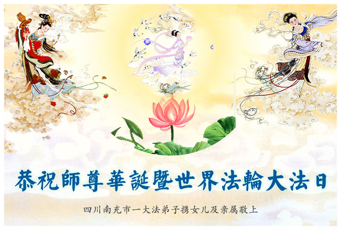 四川南充市一大法弟子攜女兒及親屬恭祝師尊華誕暨世界法輪大法日!