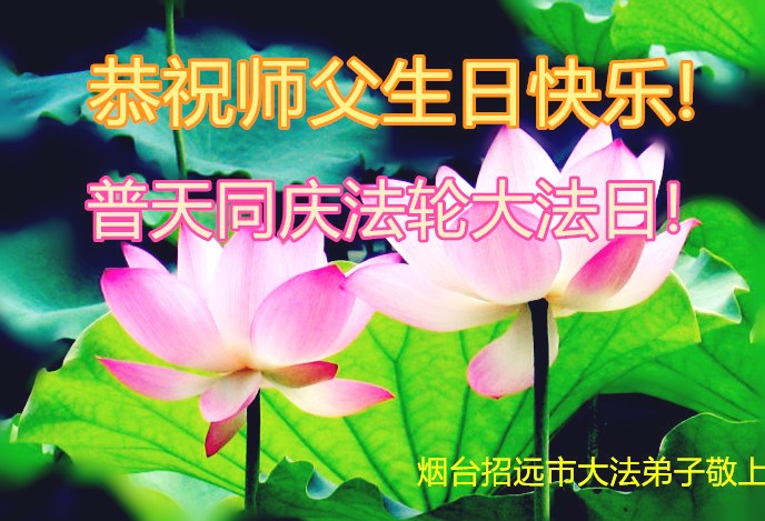 山東煙台招遠市區一學法小組大法弟子恭祝師父生日快樂!普天同慶世界法輪大法日!