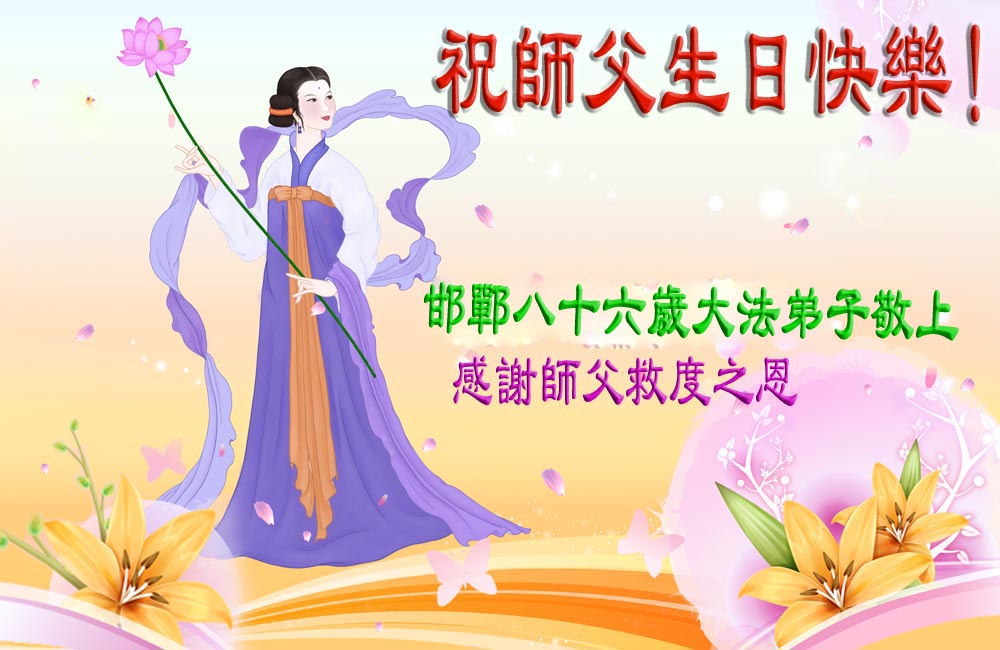 河北省邯鄲八十六歲大法弟子恭祝師父生日快樂!