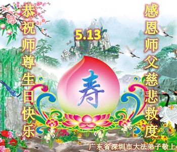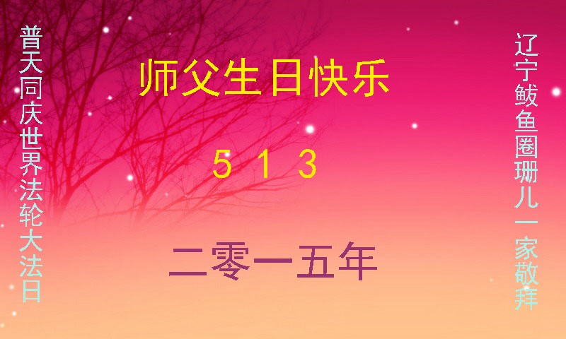 在「五一三」最最偉大世界法輪大法日來臨之際,首先向慈悲偉大的師尊問好! 師尊辛苦了!弟子們一定緊跟隨師尊的正法進程,抓緊時間,配合整體,揭露迫害,解體舊勢力的迫害根源,深找自己修煉的差距,比學比修,勇猛精進,完成歷史使命,兌現誓約,隨師回家。在紅潮即將落幕,大審判的序幕即將拉開,眾生覺醒,冬梅迎春,蓮花盛開,又迎來了二零一五年「五一三」這歡慶鼓舞的時刻,大法弟子們共同恭祝偉大的節日。