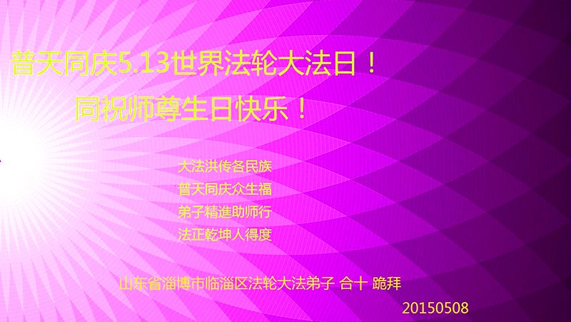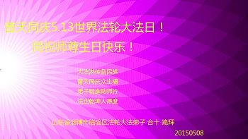 山東省淄博市臨淄區大法弟子普天同慶5.13世界法輪大法日!恭祝師尊生日快樂!