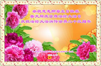 師父您好!您為救度我們大法弟子和眾生,吃了無數的苦,使眾弟子在十六年裏從以中共為代表的惡勢力製造的劫難中走了過來,在眾生得救擁有美好未來,大法洪傳二十三週年之時,大法弟子最衷心祝福大法師父生日快樂!弟子全體要正念配合,以高標準要求修好自己,全力助師正法救眾生,以回報師恩。