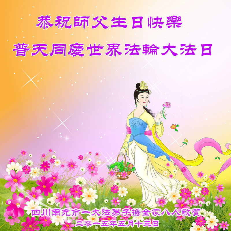 四川南充市一大法弟子攜全家八人恭祝師尊生日快樂!普天同慶世界法輪大法日!