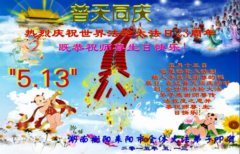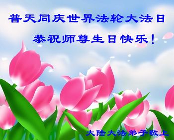 中國大陸大法弟子想念慈悲偉大的師父!五月十三日是法輪大法洪傳世界二十三週年紀念日,也是法輪功創始人李洪志大師的華誕,普天同慶!我們大法弟子遵守師父的教誨,學好法向內找修正自己,抓緊時間講清真相,多多救人,讓師父多些欣慰,少些操勞。
