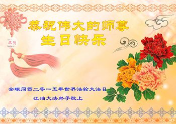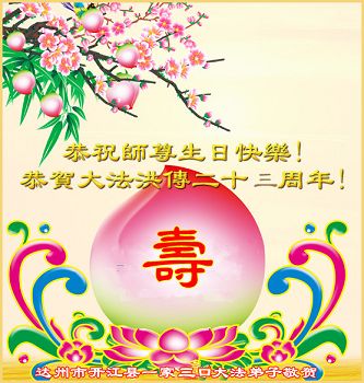 在「五一三」法輪大法開傳二十三週年紀念日暨第十六屆「法輪大法日」,法輪大法創始人李洪志師尊六十四歲華誕,普天同慶感恩的日子到來之際,我們夫妻及明真相的親朋懷著無比敬仰、無限感恩的心情,恭祝慈悲偉大的師尊生日快樂!