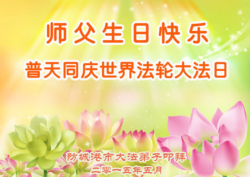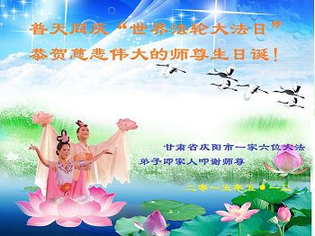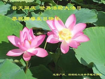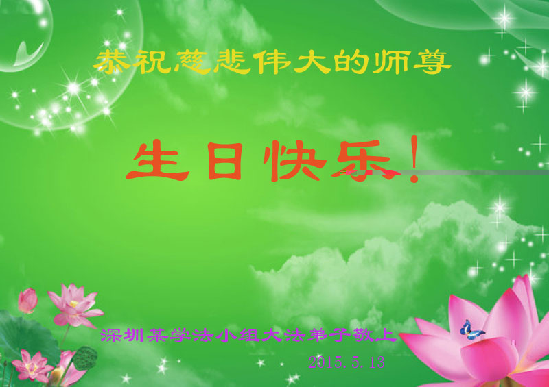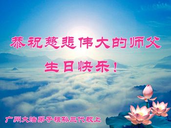 我和我先生恭祝慈悲偉大的師尊生日快樂!恭賀師尊華誕暨法輪大法日!感謝師父的慈悲苦度!我們只有精進再精進!來回報恩師的苦度!做好師父要做的三件事,救度更多的眾生。再次恭祝慈悲偉大的師尊生日快樂!