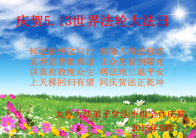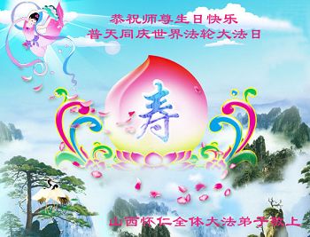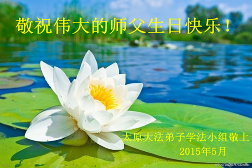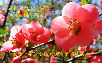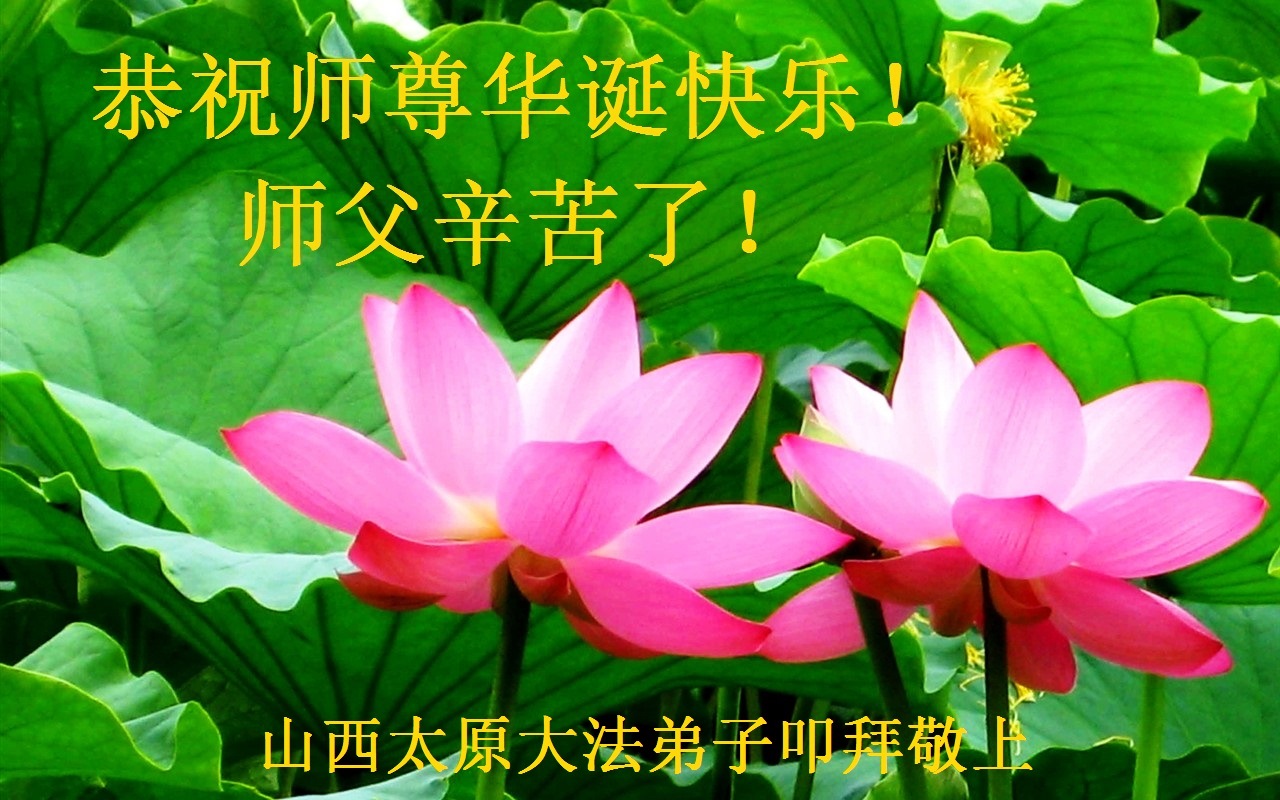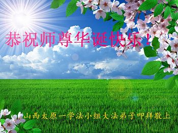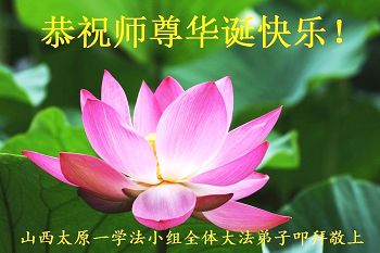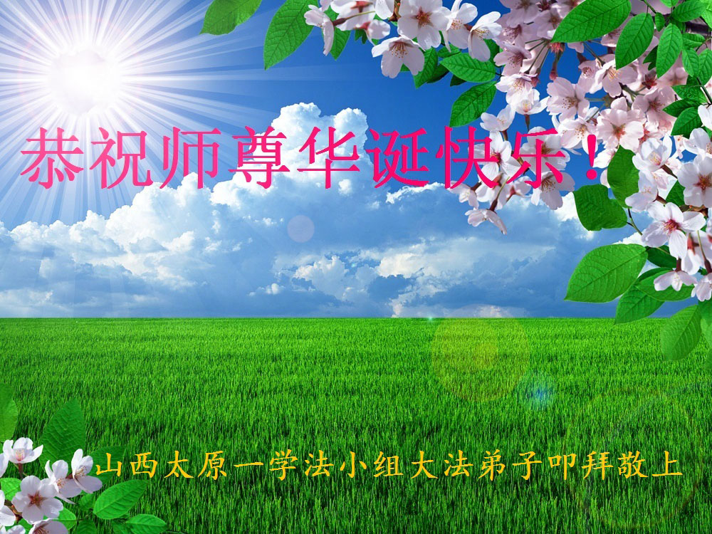 山西太原一學法小組全體大法弟子恭祝慈悲偉大的師尊華誕快樂!祝師父一帆風順,萬事如意!在新的一年裏弟子們一定聽師父的話,多學法,多向內找,時時以法歸正自己,做好「三件事」落到實處,讓師父少一份操勞,多一份欣慰!叩拜合十!