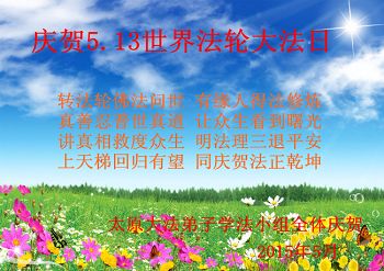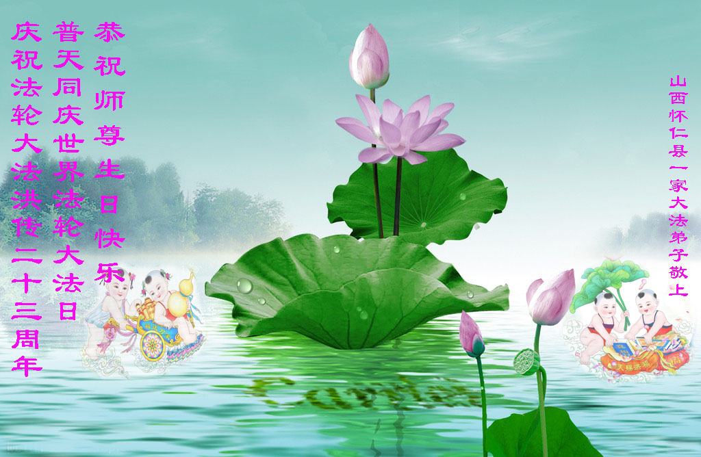 感恩大法的慈悲救度!祝願「法輪大法好,真善忍好」傳遍有緣人!一人修煉,連妻子兒子都受益。在世界法輪大法日到來之際,妻子說:「大法給我指出了一條返本歸真的路,我分享到了法輪大法帶給我的希望和美好,法輪大法洪傳23週年之際,在這裏我送上我最真誠、最美好的祝願。」兒子也上網發文祝願,表達對師父的感激崇敬之情。