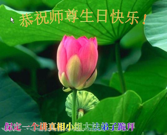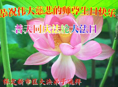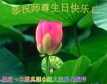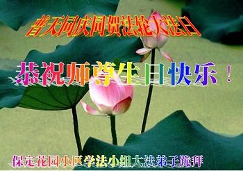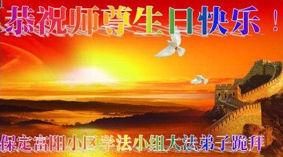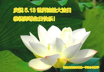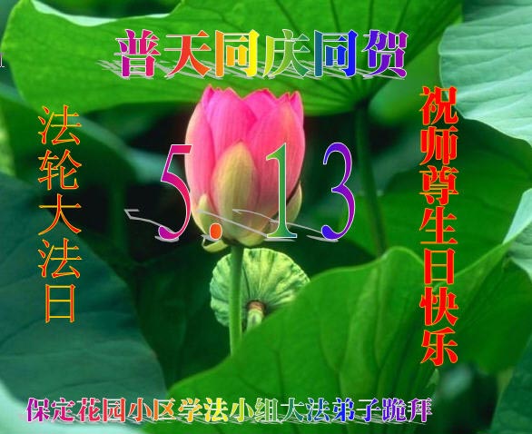 普天同慶、同祝、同頌慈悲偉大的師尊洪傳大法二十三週年!「5.13」是個神聖的日子,是世界矚目永遠難忘的世界法輪大法日。慈悲偉大的師尊將佛法「真、善、忍」的光輝撒滿蒼宇,使眾生沐浴在慈悲與威嚴同在的佛恩浩蕩中。這至高無上的法輪大法指引著我們一步一步的從迷濛中醒來、清醒、成熟。師尊,請接受我們全縣大法弟子的感恩,再次恭祝慈悲偉大的師尊生日快樂!慶祝世界法輪大法日!