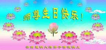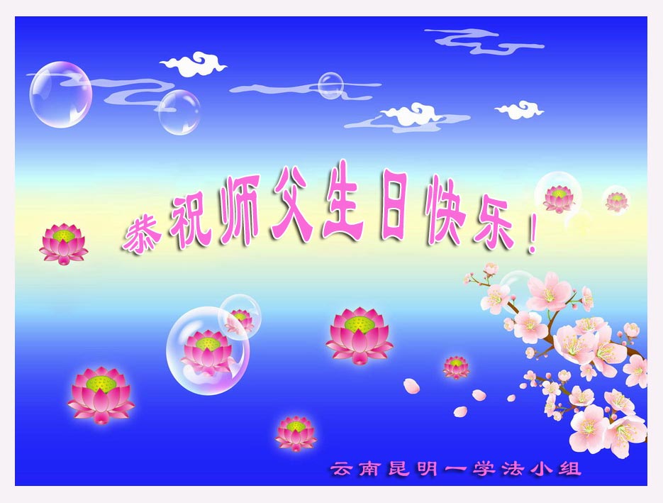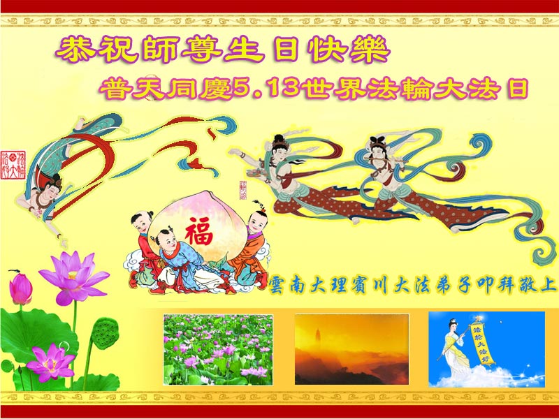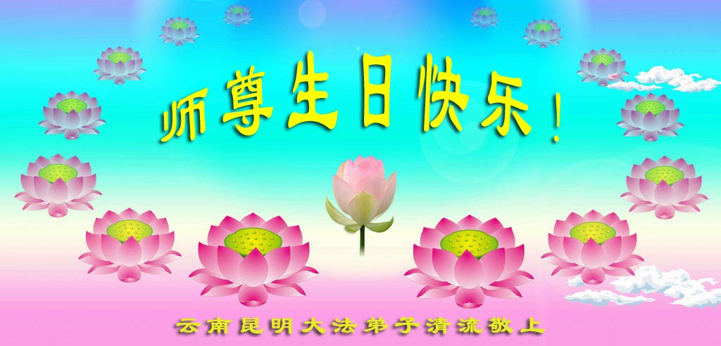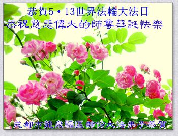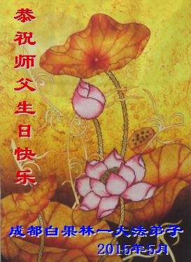我們成都大法弟子恭祝師尊生日快樂!恭賀世界法輪大法日暨大法洪傳二十三週年!在這個喜慶的日子裏,我們道一聲師尊辛苦了!我們在今後的修煉中一定要更加努力學好法、向內找、修好自己、努力做好三件事、跟師尊回家。