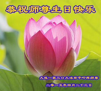 值此一年一度的世界法輪大法日來臨之際,弟子和全家在遼寧大連遙祝師尊節日快樂!正法必成!弟子們決心堅定地信師信法,正念正行,走師尊安排指引的專一、精進、實修、圓滿之路,做到心存真、善、忍,修去名、利、情。