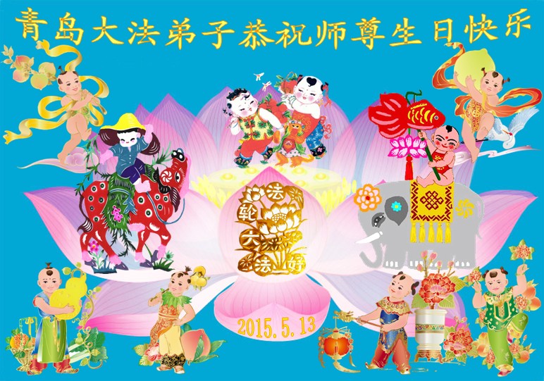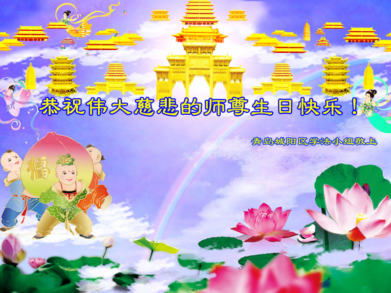 山東省青島大法弟子敬祝師尊生日快樂!恭祝法輪大法洪傳二十三週年!