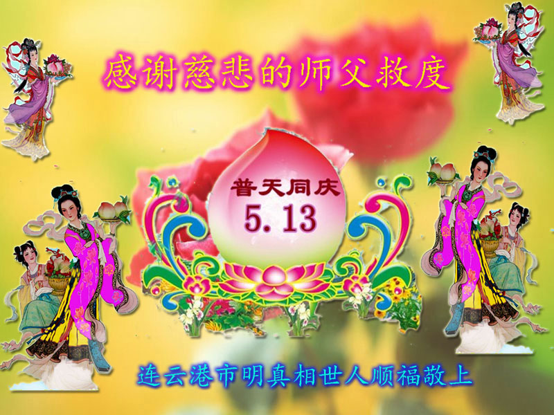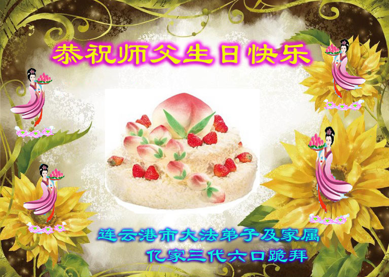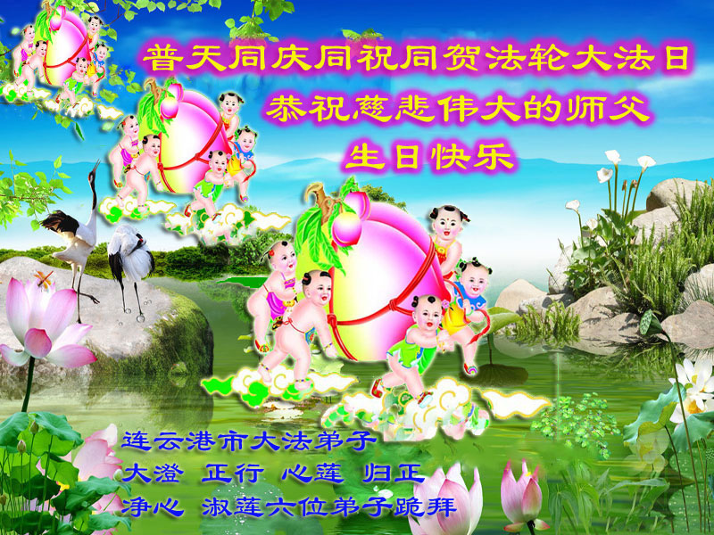 感謝師尊多年來為弟子巨大的承受和付出!感謝師尊無償的給予!弟子們決不會辜負師尊的慈悲苦度,不會讓師尊的心血白費。師尊您辛苦了!弟子們會更加精進,多學法,修出無限慈悲,救度更多眾生,兌現自己來世的誓約。一定要真修、實修,盡全力圓容師尊所要,助師正法早日成功。連雲港市全體大法弟子跪拜師尊!