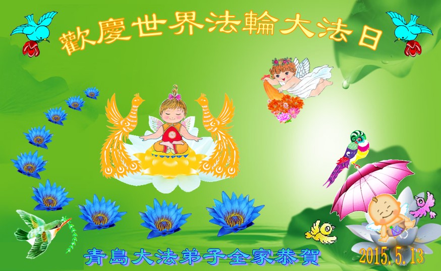 山東省青島大法弟子全家敬賀世界法輪大法日!恭祝慈悲偉大的師尊生日快樂!