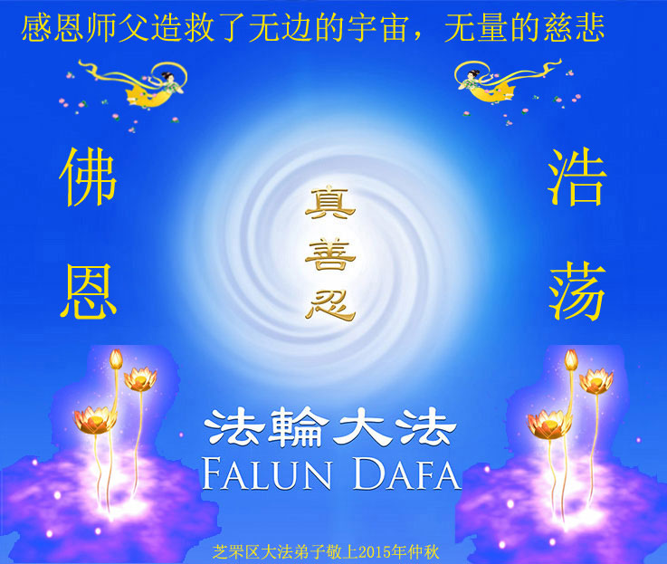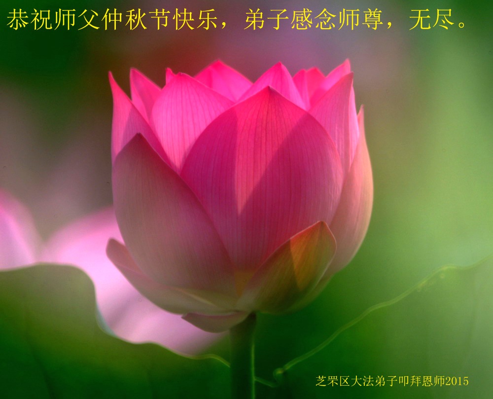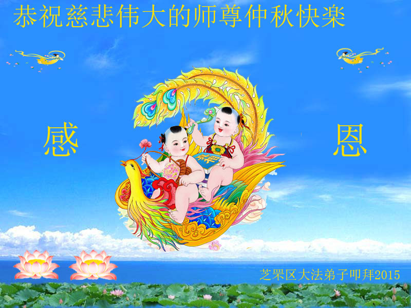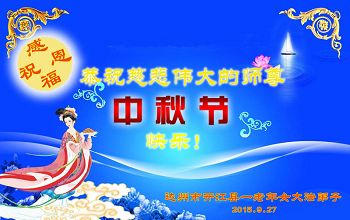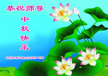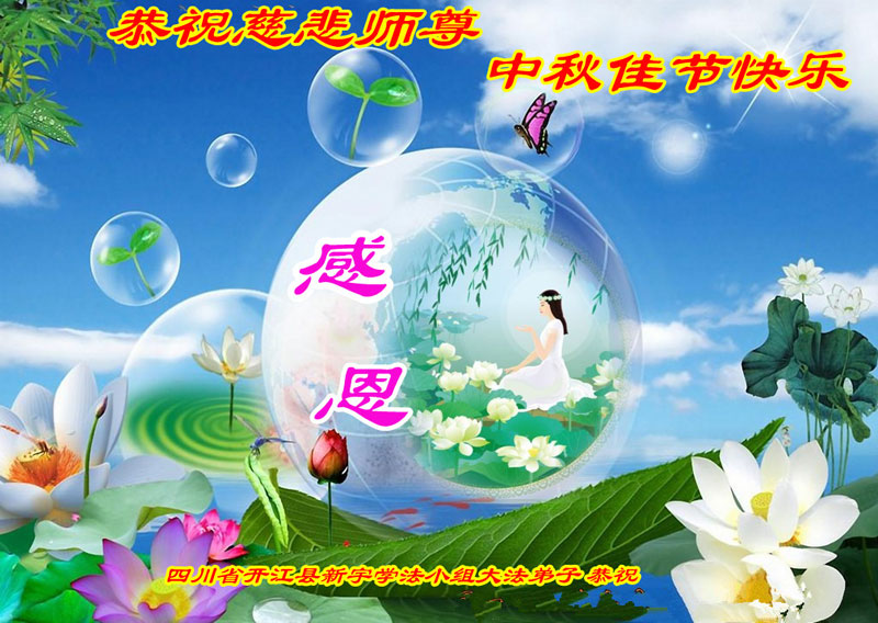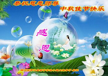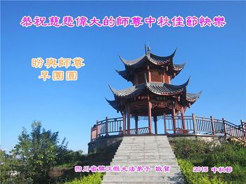 在一年一度的中秋節來臨之時,在舉家團聚萬家團圓的佳節之日,弟子更加思念慈悲偉大的師父!在此弟子們衷心的祝願慈悲偉大的師父中秋節快樂!在師父無量慈悲呵護下,我們這片的弟子都參與了風起雲湧的訴江大潮。我們感恩師父、感恩大法!感恩您的無量威德。我們為參與了訴江而自豪!師父是您呵護著弟子走到了今天,浩浩師恩弟子無以為報,我們一定遵照師尊教誨,靜心學法,修好自己,放下自我、擴大心胸,互相配合圓容師父所要,救度更多的眾生,緊跟正法進程,走好最後的路。再一次感恩慈悲偉大的師父!
