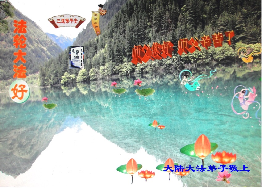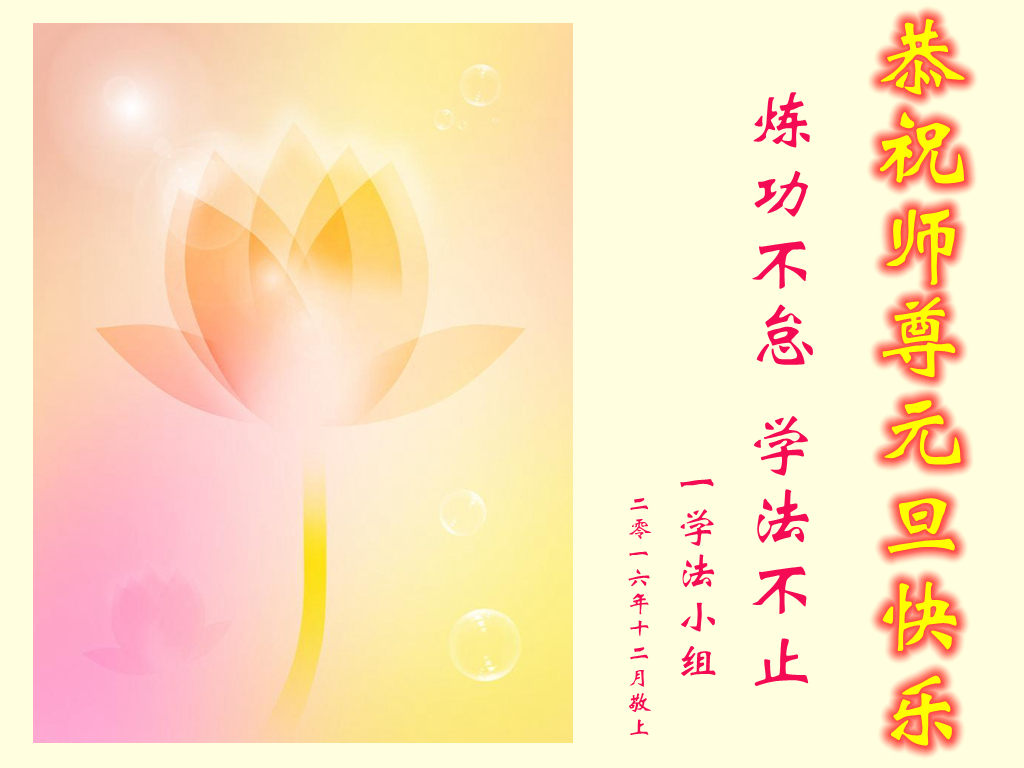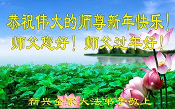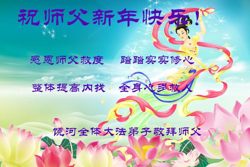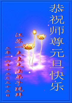 大陸一老年大法弟子及全家恭祝慈悲偉大的師尊新年快樂!萬事如意。多一些安慰,少一些操勞。在新的一年裏,更加精進實修,早日跟師尊回家。