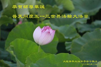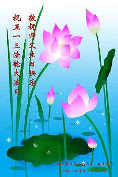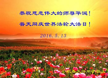 在此時刻向偉大李洪志師父敬拜,恭祝五一三世界法輪大法日同時祝師尊生日快樂!弟子在今後努力抓緊時間實修,發下一切執著達到修煉人最終的標準,認真對待修煉中的每一件事,抓住每一個機會救度世人,勇猛精進,不辱使命。