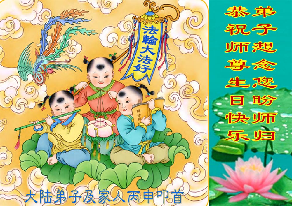 尊敬的師父您好!我們全家大法弟子恭祝師父生日快樂!弟子們都非常想念師父,希望能早日與師父相見,謝謝師父的救度。