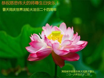 湖南省岳陽市華容縣全體大法弟子恭祝慈悲偉大的師尊生日快樂!恭賀世界法輪大法日!