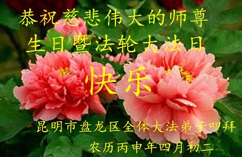 雲南昆明市盤龍區一學法小組全體大法弟子恭祝師尊華誕暨慶祝世界法輪大法日!