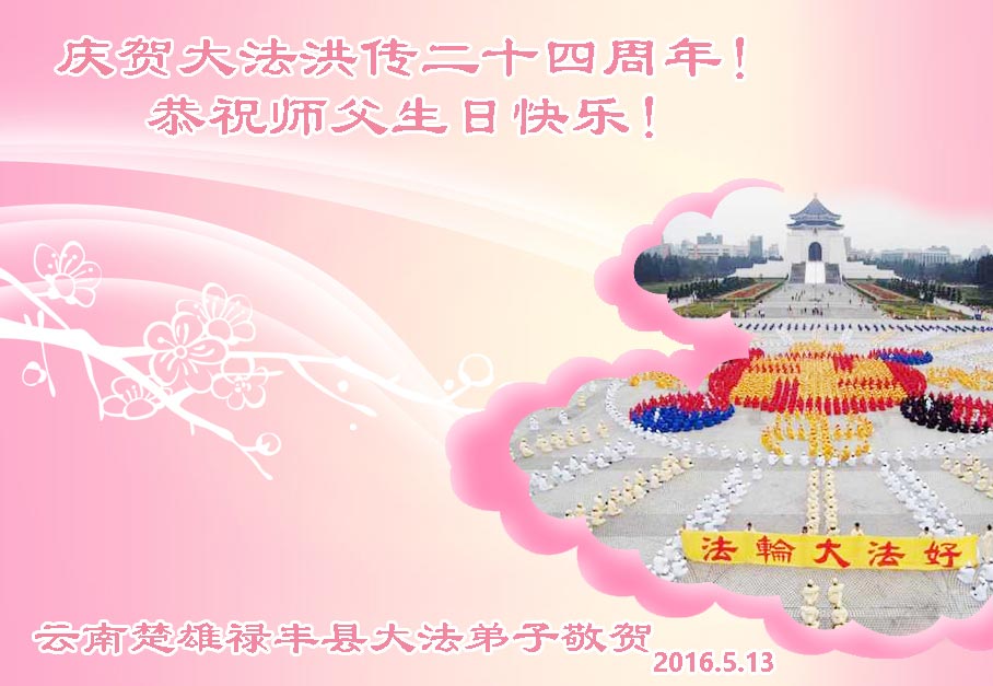 雲南省楚雄州楚雄市祿豐縣大法弟子恭賀法輪大法洪傳二十四週年!恭祝師尊生日快樂!