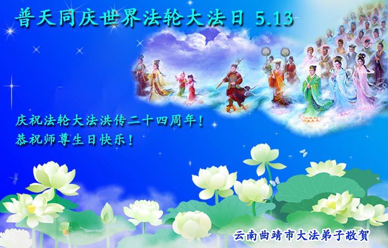 雲南曲靖市大法弟子恭賀法輪大法洪傳二十四週年!恭祝師尊生日快樂!