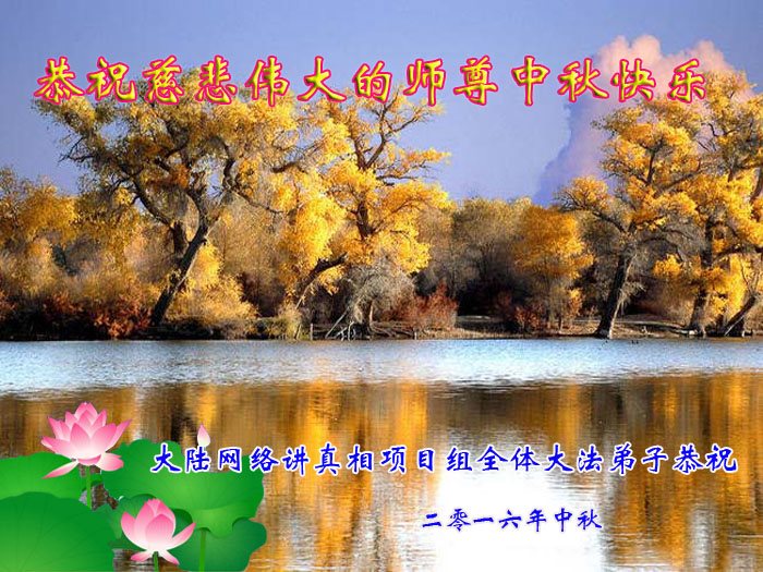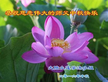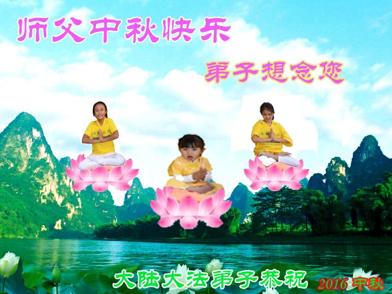 在2016年中秋來臨之際,我們全家祝師父中秋快樂!修煉人要做好三件事,每天都修煉,嚴格要求自己,不修煉的家人感謝師父和大法給予的一切,也按真善忍標準做好人。