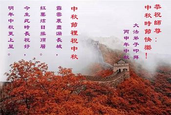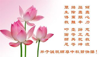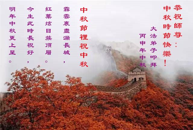 尊敬的師父:您好!一年一度的中秋佳節再度來臨了。弟子在這象徵闔家團聚的節日裏向慈悲偉大的師父問好!恭祝師父中秋快樂!無論內在和外在,無論有形和無形,弟子一定在兌現來時的神聖誓約、實現大法弟子的助師與救度眾生、證實法的真正目地的最後過程中真正跟上師父的正法洪勢,真正做好三件事,真正正念正行,真正學好法,真正向內找,真正配合好,真正做到一舉一動一思一念不負師恩不負眾望。千言萬語彙成一句話:更加理性的走好走正最後的助師與救度眾生、證實法的正法路,精進實修,做好三件事,兌現史前誓約,圓滿隨師還!師父辛苦了!叩謝師父的慈悲救度!合十!